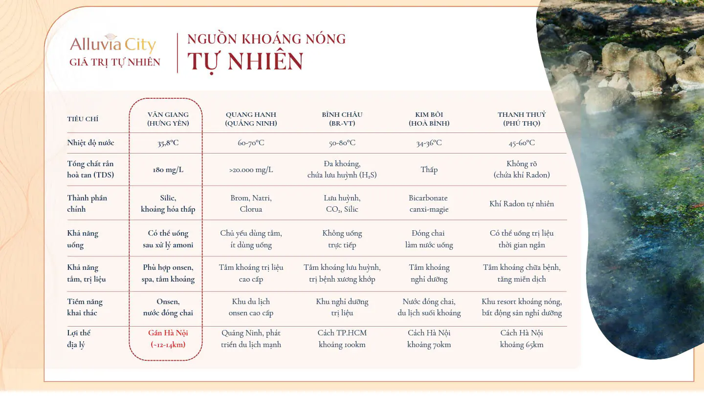 Tiện ích nghỉ dưỡng và chăm sóc sức khỏe: Với nguồn khoáng nóng tự nhiên, dự án sẽ có các khu spa, tắm khoáng, resort… giúp cư dân thư giãn, tái tạo năng lượng ngay tại nhà.