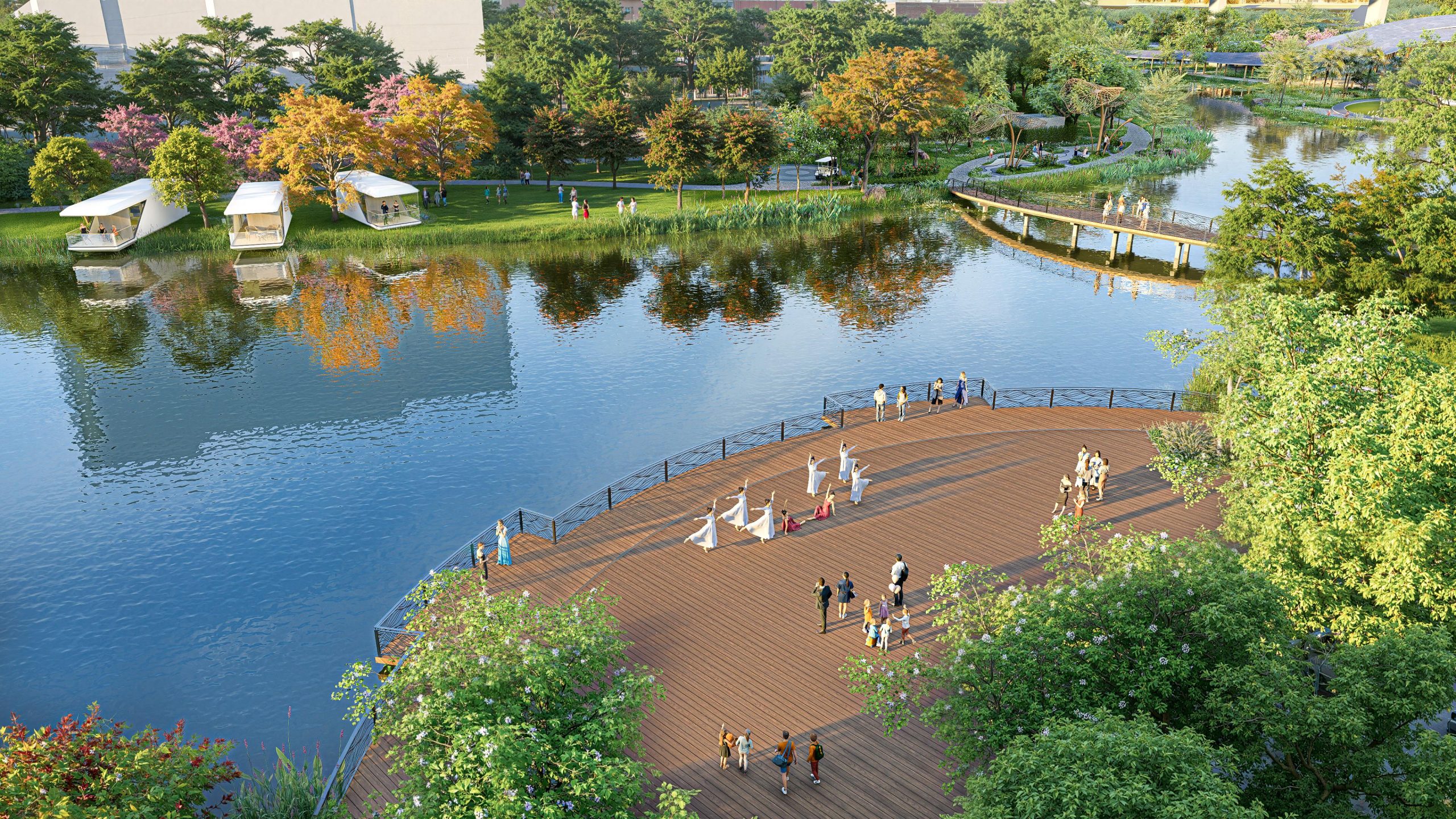 Quy mô lớn, mật độ xây dựng thấp: Với tổng diện tích gần 200 ha nhưng mật độ xây dựng chỉ 16%, phần lớn diện tích còn lại được dành cho cây xanh, mặt nước và các tiện ích công cộng. Điều này tạo ra một không gian sống xanh, trong lành, đảm bảo sự riêng tư và chất lượng cuộc sống cao cấp cho cư dân.